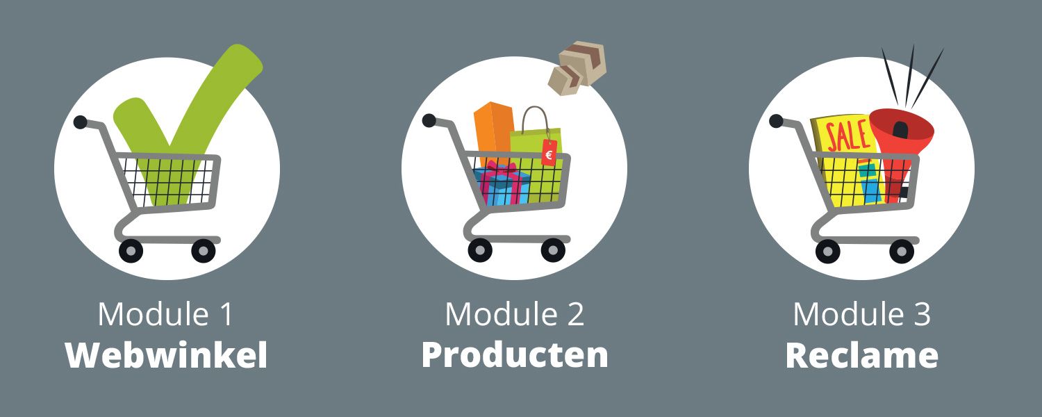 • Het proces van bedenken, maken, vullen en beheren van een webshop komt aan bod in 3 modules.